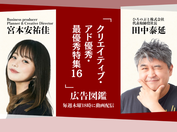 毎週木曜18時に動画を更新。田中泰延氏と宮本安祐佳氏が、直近で話題となった様々な広告事例を紹介する番組「広告図鑑」。